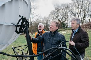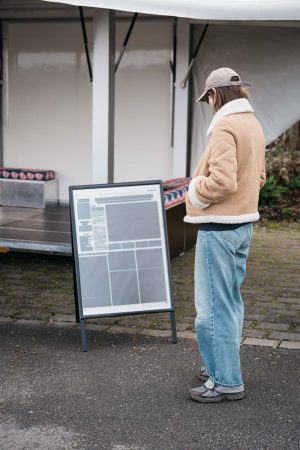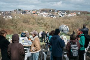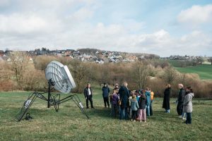 deshalb sind wir hier. Zwischen Schule und Sportplatz ist er aufgestellt: Mona Schulzeks Outer Space Transmitter. Er sendet Botschaften ins All. Direkt aus Breckerfeld. Eine Grundschulklasse kommt, holt die Stifte raus, die Zettel. Die Kinder haben mehr Fragen als Wünsche, schonmal interessant, sie richten sie aber nicht ziellos ins All, in alles, was da sein könnte, sondern gehen direkt rein, in medias res,